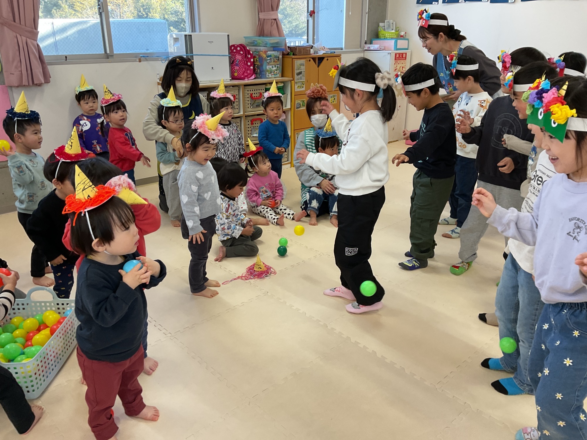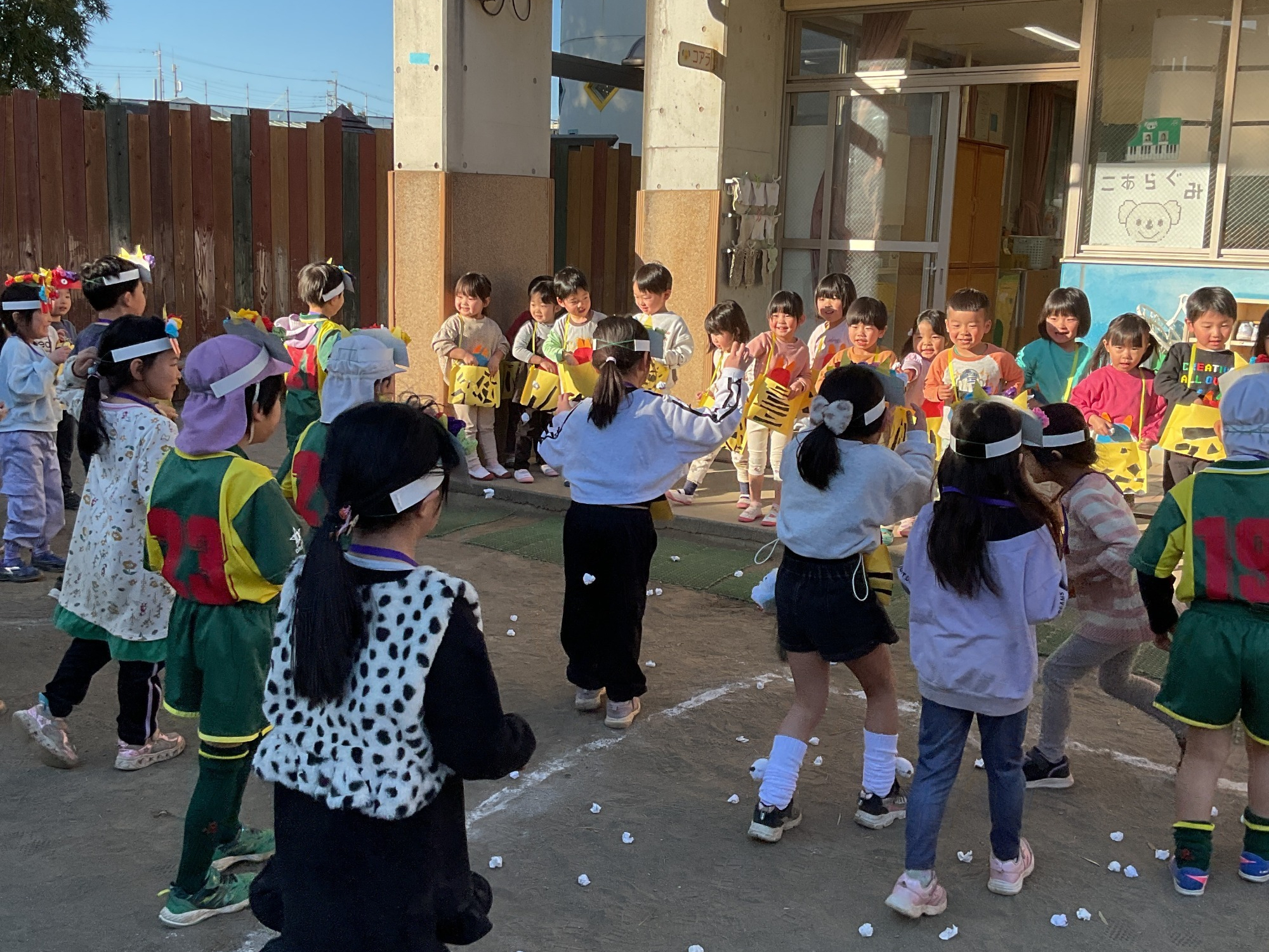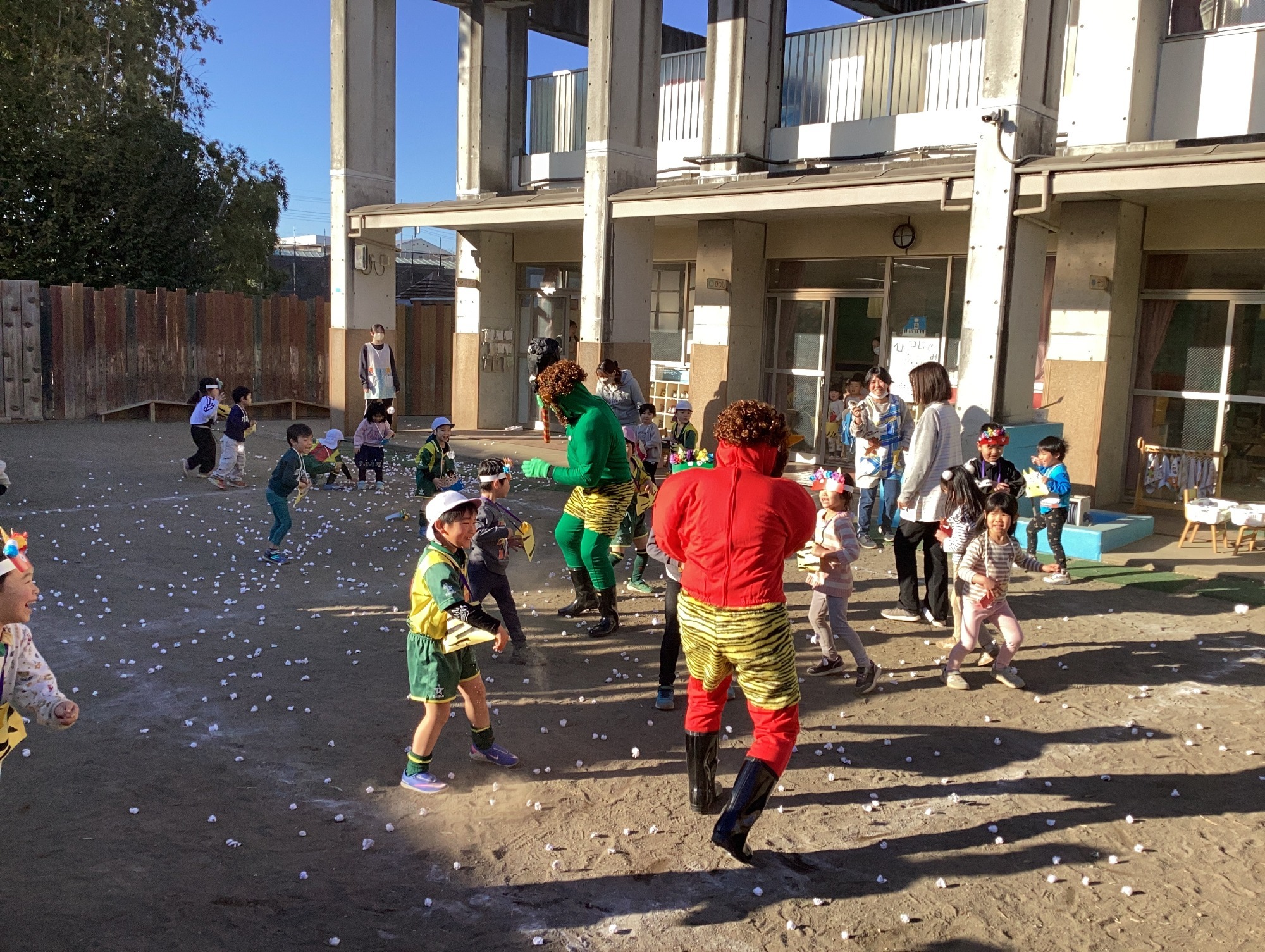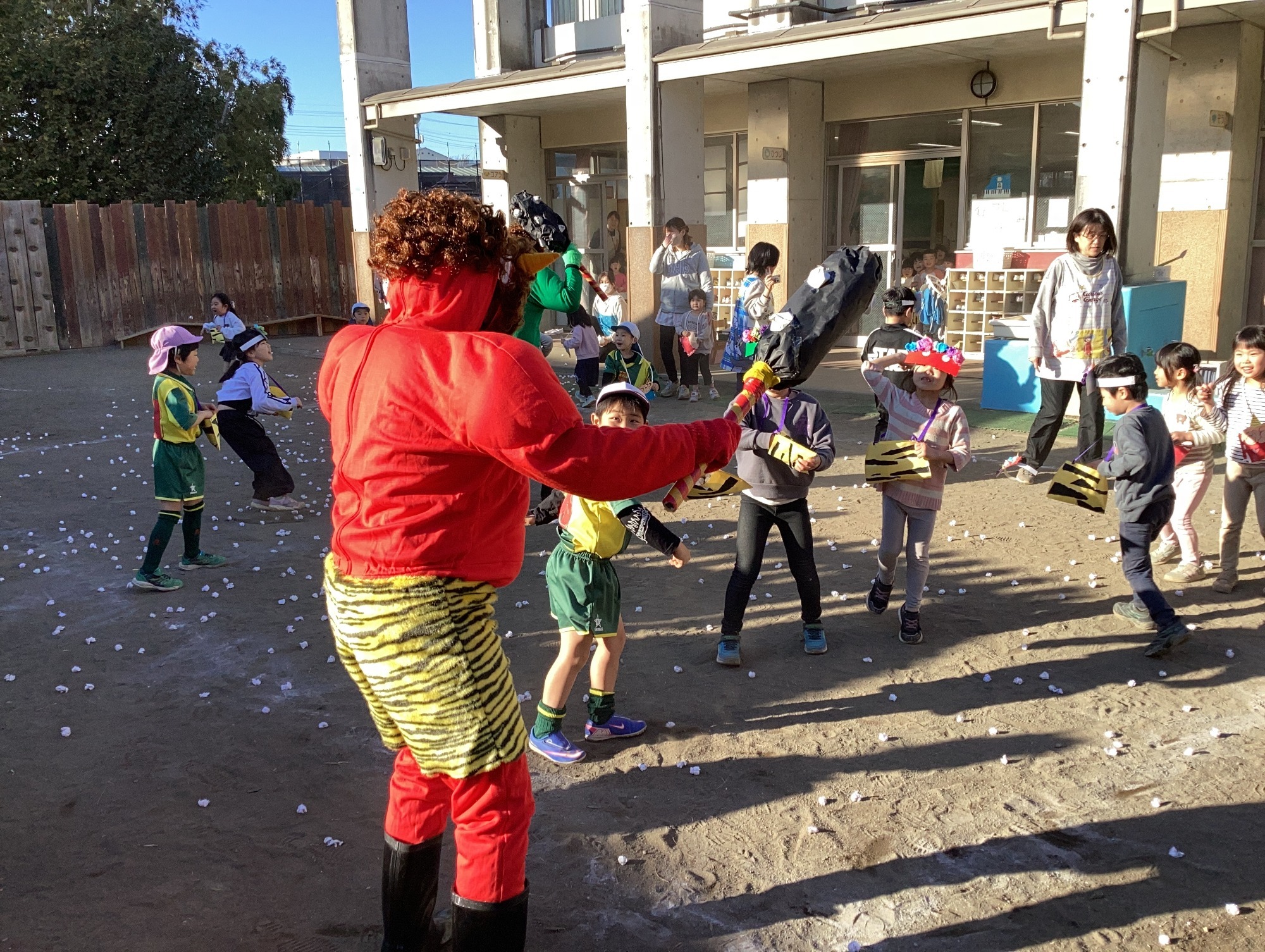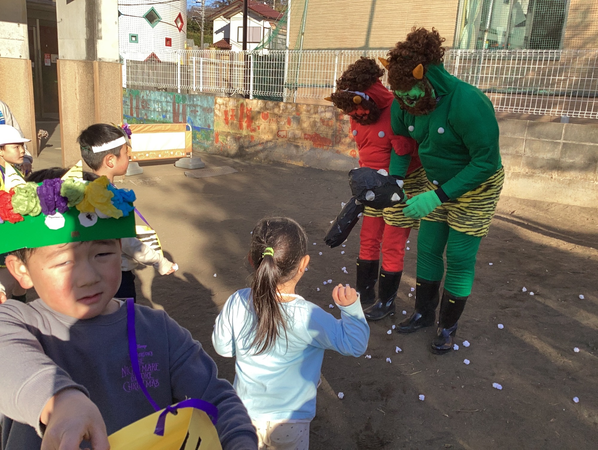 豆まきしました。5歳児が鬼に変身し乳児組に行きました。